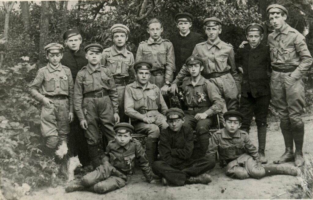 Suchedniowscy skauci, 1913 rok. Pierwsza drużyna skautowa zorganizowana przez legendarnego Stanisława Magnusa . W środkowym rzędzie, pierwszy z prawej – Mieczysław Żakowicz.