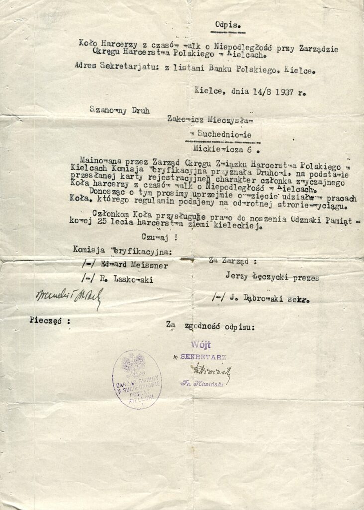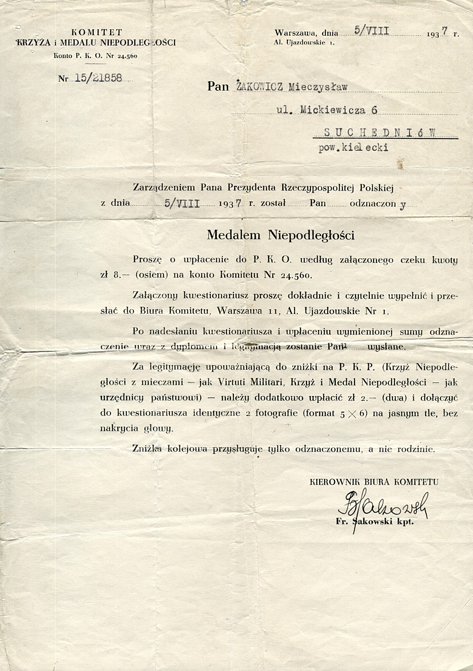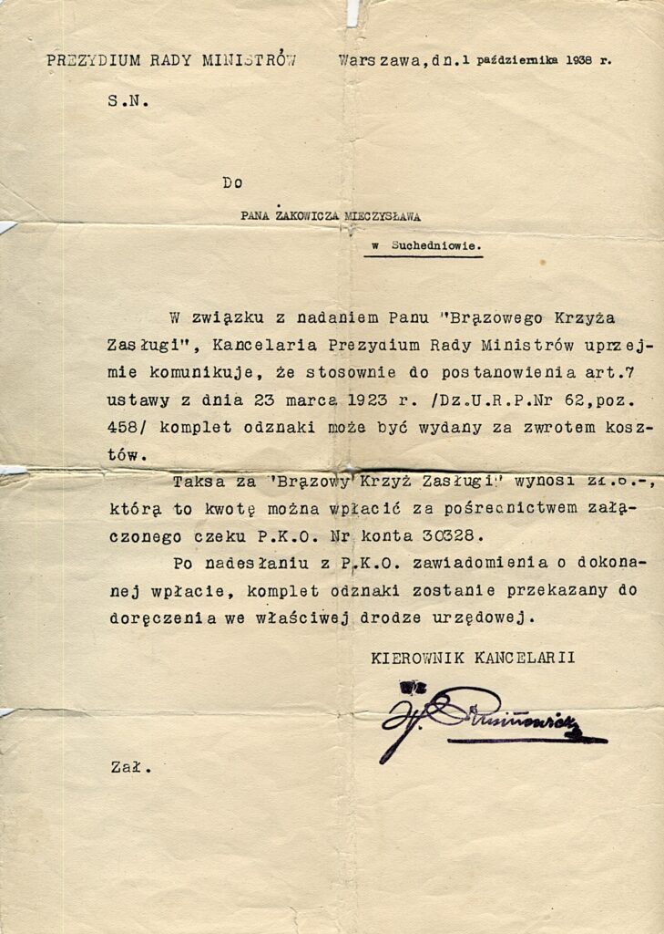 Urodzony w Suchedniowie, jego życiorys jest pełen wspaniałych i heroicznych wydarzeń. Młodość Mieczysława była naznaczona harcerstwem. Wtedy to dołączył do Orląt Lwowskich, młodzieżowej organizacji, która walczyła o niepodległość miasta Lwowa. W trudnych czasach walk na kresach wschodnich Mieczysław Żakowicz, używający pseudonimu „Sokół”, czołgał się wśród zabitych, broniąc miasta przed Ukraińską Armią Halicką. Ta odwaga i poświęcenie zostały docenione, gdyż został odznaczony honorową odznaką „Orlęta” przez dowódcę Armii „Wschód” 19 marca 1919 roku. Nie tylko walka o niepodległość była częścią życia Mieczysława. W Suchedniowie angażował się również społecznie, będąc członkiem Polskiej Organizacji Wolności, gdzie pełnił funkcję skarbnika w obwodzie Suchedniów. Działalność społeczna Mieczysława była znacząca i przyniosła mu uznanie, w postaci Odznaki Pamiątkowej 25-lecia harcerstwa ziemi kieleckiej przyznanej przez Zarząd Główny Harcerstwa Polskiego w Kielcach. Jego zasługi dla niepodległej Polski doceniły również władze państwowe. Prezydent Rzeczypospolitej Polskiej odznaczył go 5 sierpnia 1937 roku Medalem Niepodległości za pracę w dziele odzyskania niepodległości. Ponadto, w uznaniu jego społecznego zaangażowania i wkładu w rozwój Polski, został uhonorowany 19 września 1938 roku Brązowym Krzyżem Zasługi nadanym przez prezesa Rady Ministrów Sławoja Składkowskiego. Historia Mieczysława Żakowicza to piękny przykład odwagi, poświęcenia i zaangażowania w walkę o niepodległość oraz rozwój lokalnej społeczności. Jego historia jest częścią dziedzictwa narodowego, która zasługuje na pamięć i szacunek. Mieczysław Żakowicz jest symbolem niezłomnego ducha polskiego patriotyzmu i heroizmu. Niech jego historia będzie inspiracją dla kolejnych pokoleń do oddania się służbie dla ojczyzny oraz rozwoju lokalnej społeczności. Jego poświęcenie i zasługi zasługują na uznanie i pamięć społeczną.