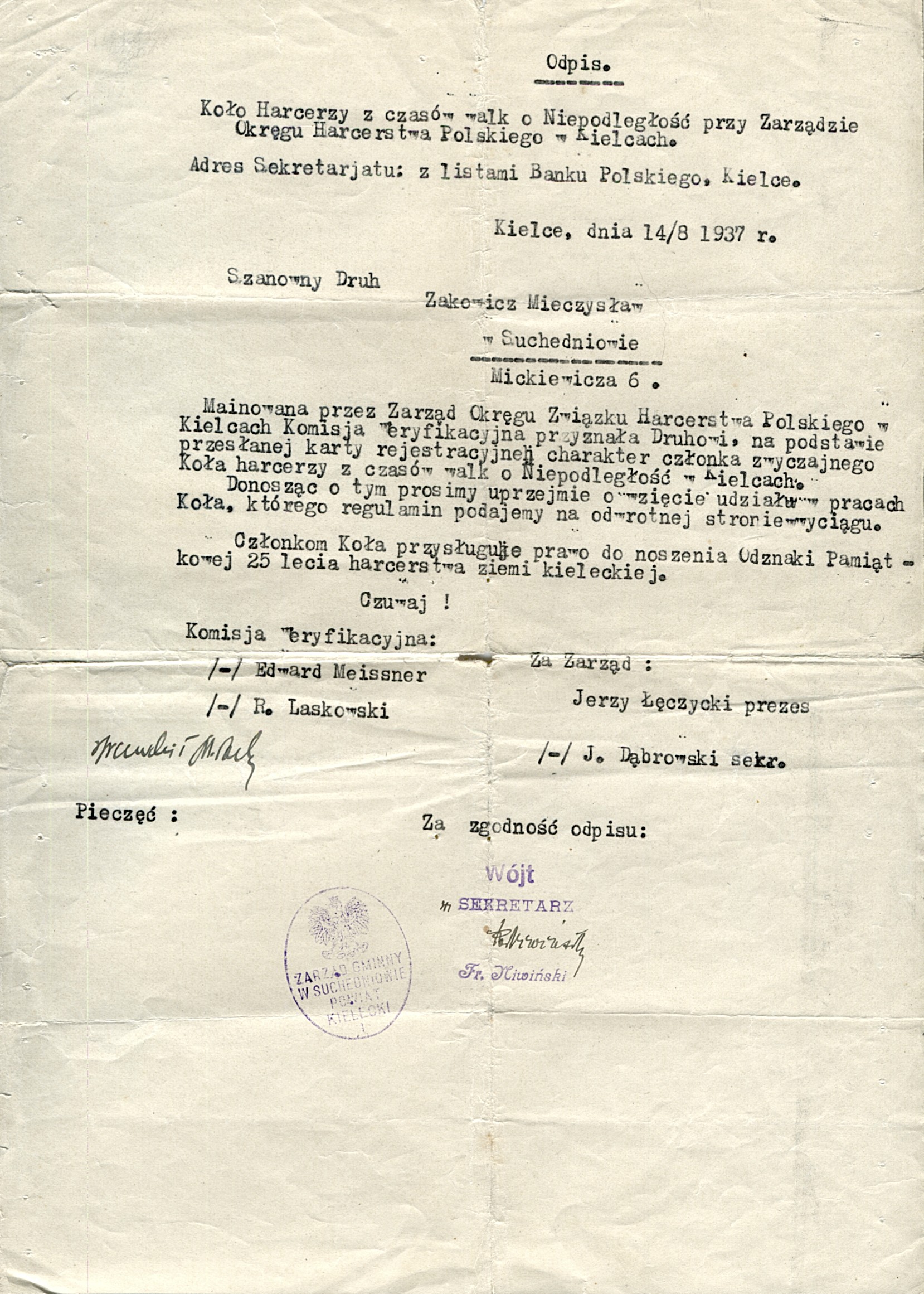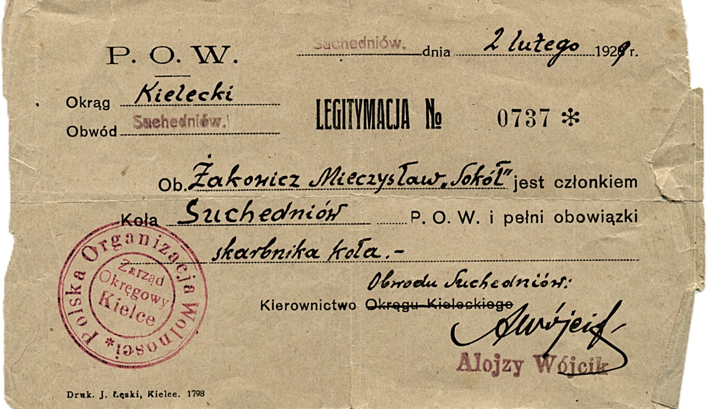Zaświadczenie Polskiej Organizacji Wojskowej, informacja o pełnieniu funkcji skarbnika koła – 2.2.1928 rok.