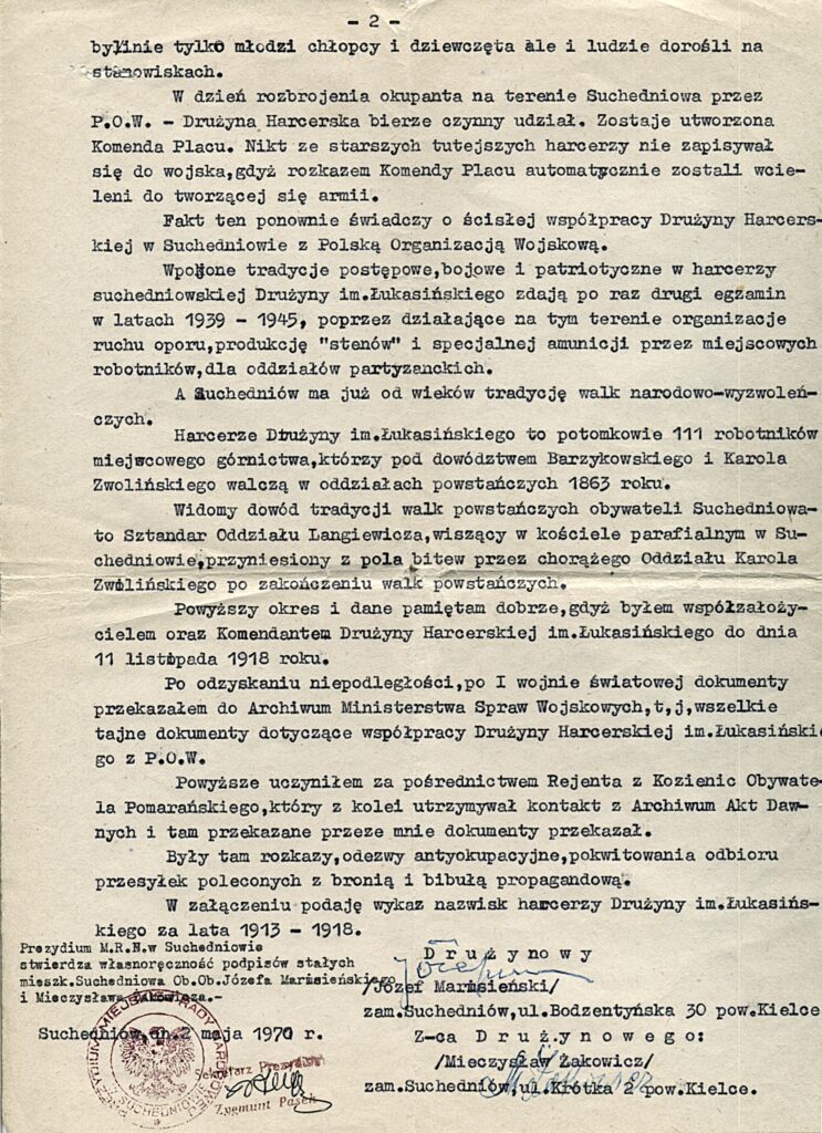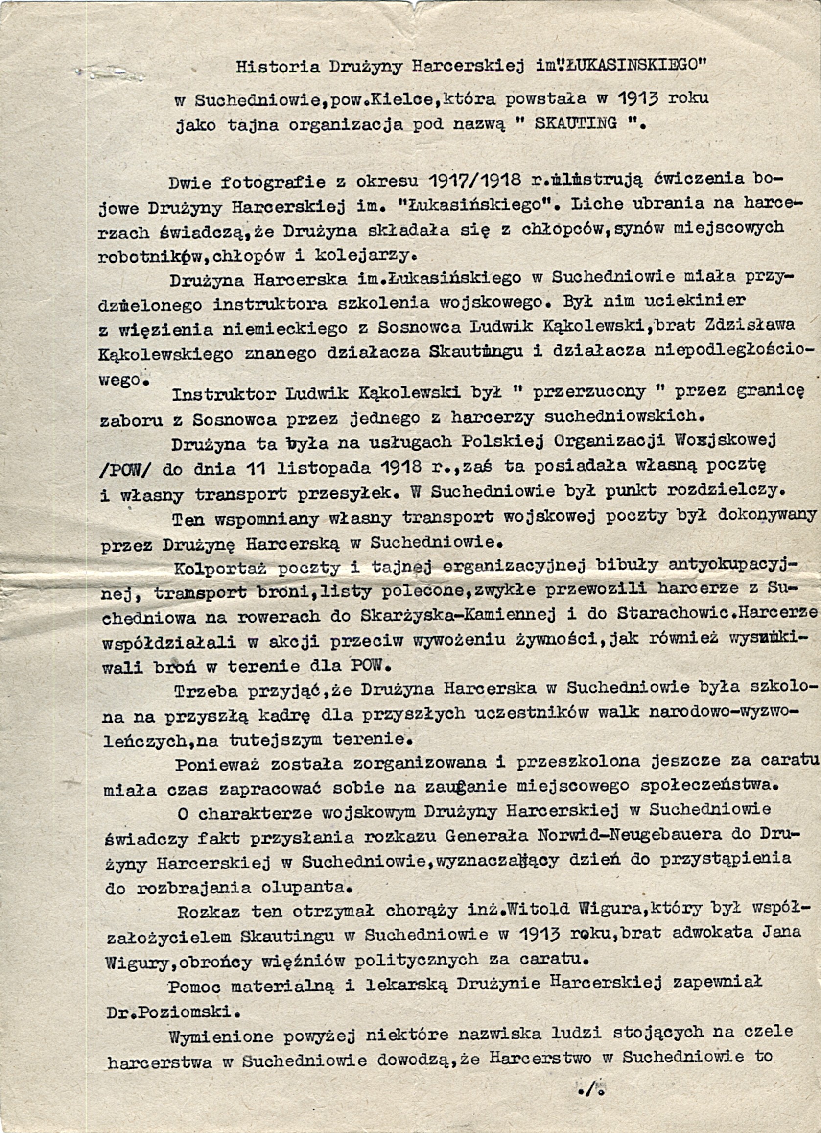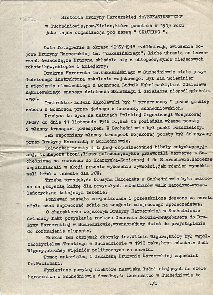 Historia Drużyny Harcerskiej im. Łukasińskiego, która powstała w 1913 roku jako tajna organizacja pod nazwą „Skauting”. Działalność tej drużyny została spisana przez drużynowego Józefa Marusieńskiego i zastępcę drużynowego Mieczysława Żakowicza i potwierdzona pieczęcią