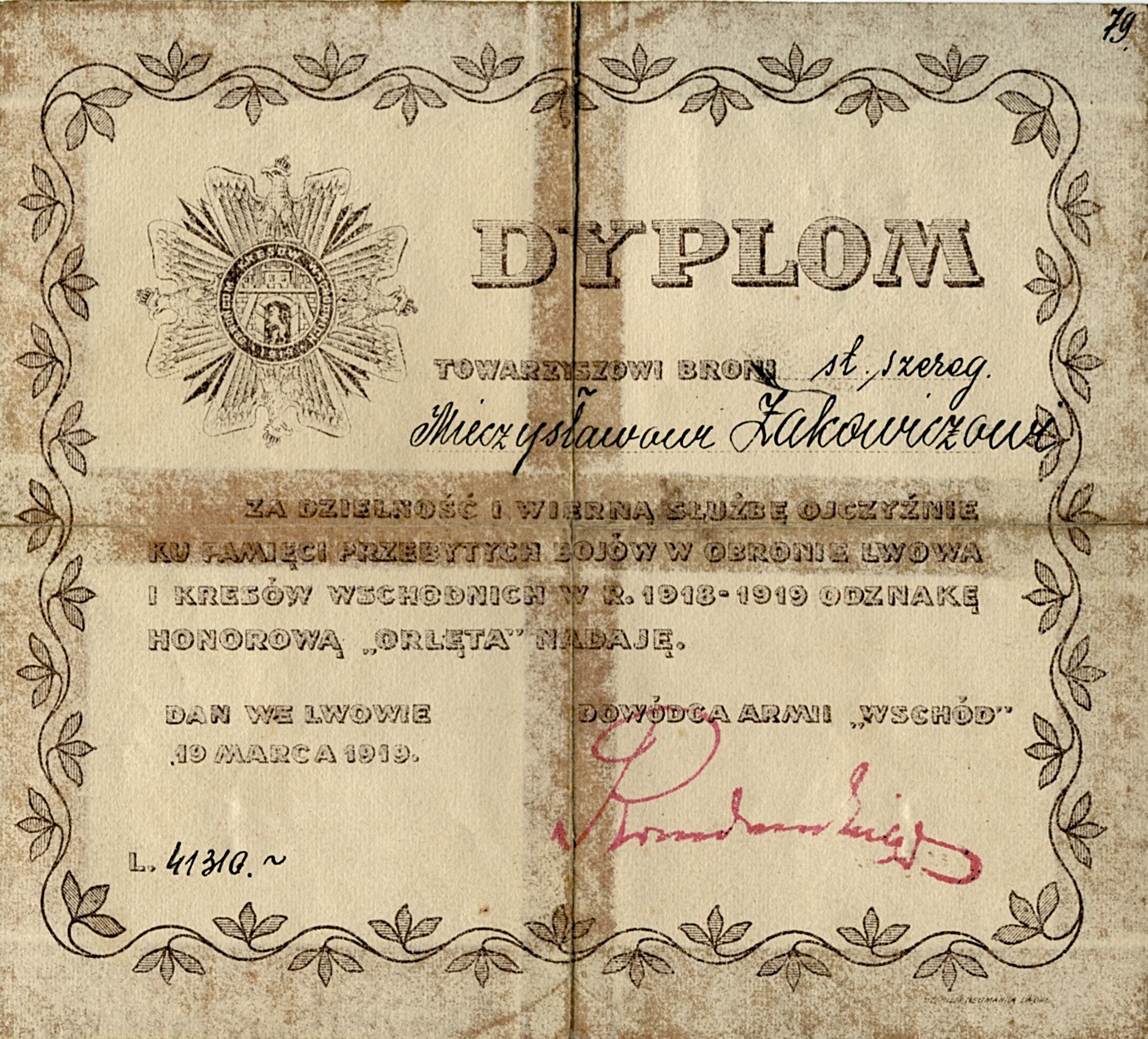Dyplom, nadanie odznaki honorowej ”Orlęta” Lwów –  19.3.1919 rok.